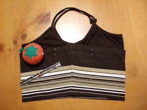 Lật phải phần thân dưới của áo và gập lên sát phần quai áo, sau đó, dùng đinh ghim cố định.