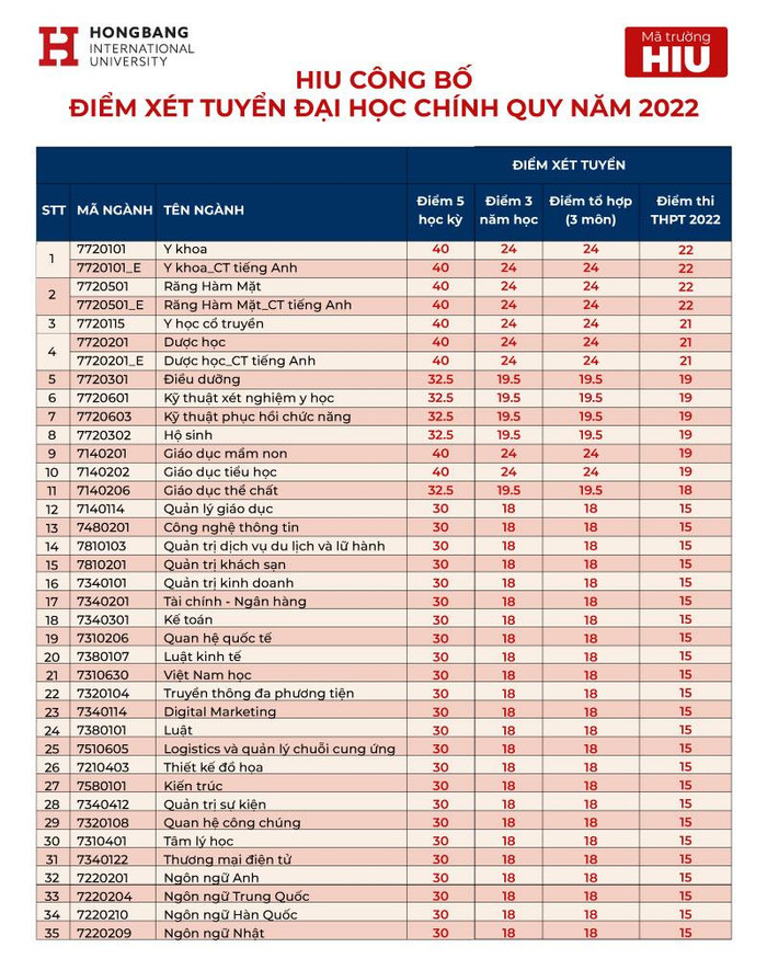 Trong đợt này, HIU xét tuyển bổ sung đại học chính quy năm 2022 cho 35 ngành đào tạotheo 02 phương thức: xét kết quả thi tốt nghiệp trung học phổ thông 2022 và xét học bạ.