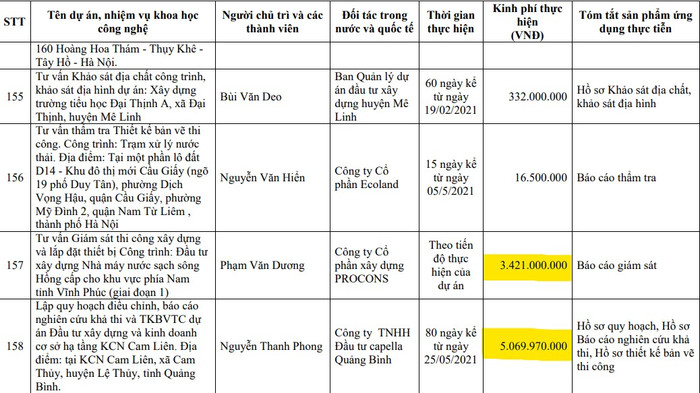 Bên cạnh đó, trong năm học này một số dự án khác cũng có con số kinh phí thực hiện đạt xấp xỉ như: Dự án "Lập quy hoạch điều chỉnh, báo cáo nghiên cứu khả thi và TKBVTC dự án Đầu tư xây dựng và kinh doanh cơ sở hạ tầng khu công nghiệp Cam Liên. Địa điểm: tại khu công nghiệp Cam Liên, xã Cam Thủy, huyện Lệ Thủy, Quảng Bình" có kinh phí 5.069.970.000 đồng do ông Nguyễn Thanh Phong chủ trì.
