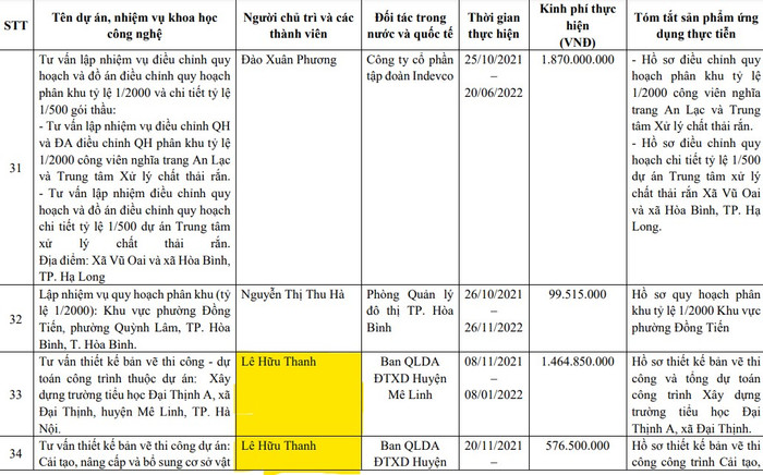 Ngoài ra, Tiến sĩ Lê Hữu Thanh cũng được đề cập đến với vai trò là người chủ trì của một số dự án khác với số kinh phí thực hiện hàng trăm triệu đồng/ dự án.