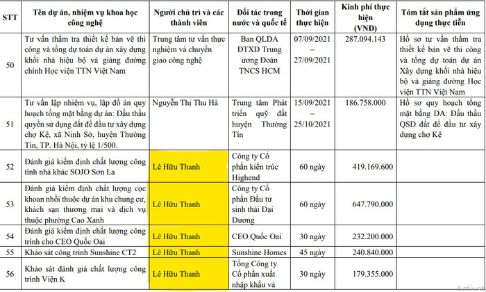 Cụ thể, người này chủ trì dự án "Đánh giá kiểm định chất lượng công trình nhà khách SOJO Sơn La", với kinh phí 419.169.000 đồng, được thực hiện trong 60 ngày. Dự án "Đánh giá kiểm định chất lượng cọc khoan nhồi thuộc dự án chung cư, khách sạn thương mại và dịch vụ thuộc phường Cao Xanh" với kinh phí 647.790.000 đồng, được thực hiện trong 60 ngày.