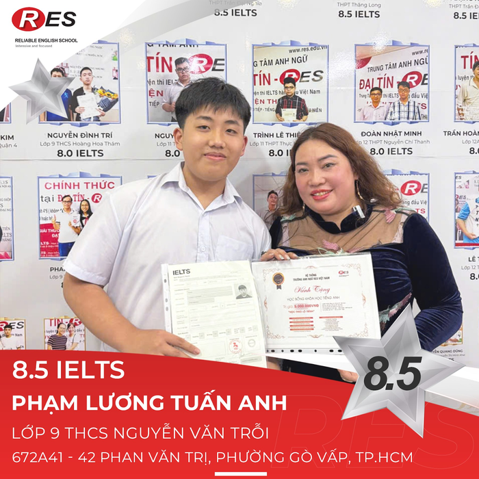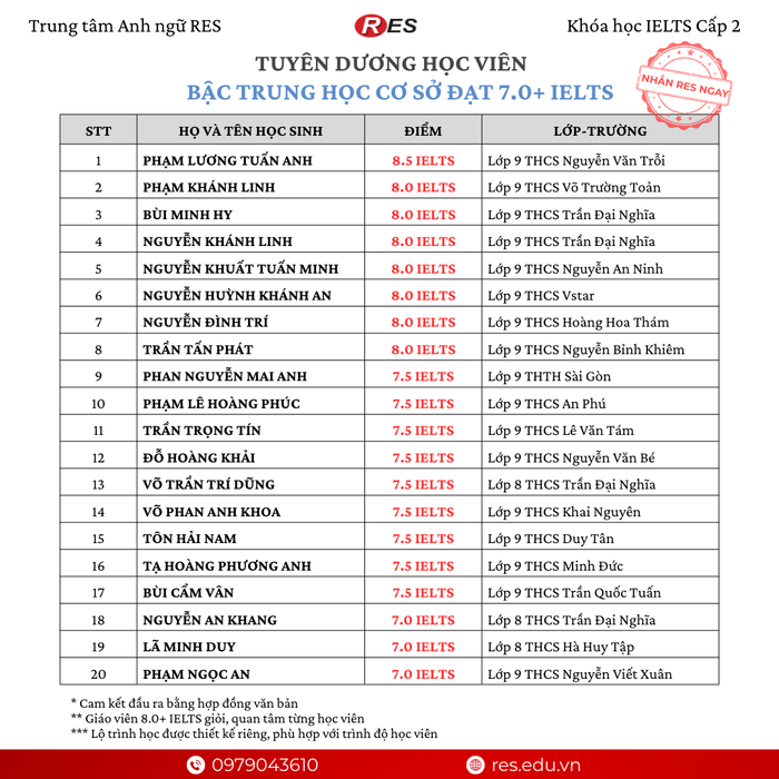 Với định hướng đào tạo dài hạn và đội ngũ giáo viên chuyên môn cao, Trung tâm Anh ngữ RES đã và đang giúp nhiều học viên cấp trung học cơ sở đạt điểm IELTS ấn tượng.