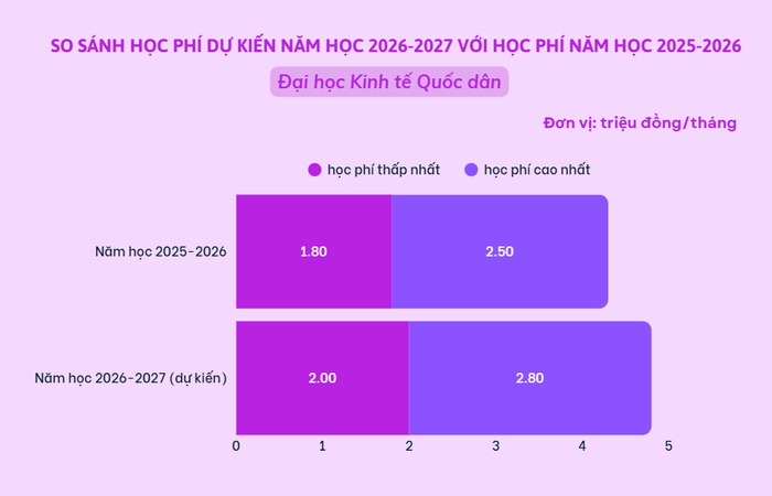 Đại học Kinh tế Quốc dân dự kiến học phí đại học chính quy chương trình chuẩn theo ngành/chương trình học năm 2026 khoảng từ 20 - 28 triệu đồng/năm, tăng 2-3 triệu so với năm 2025.