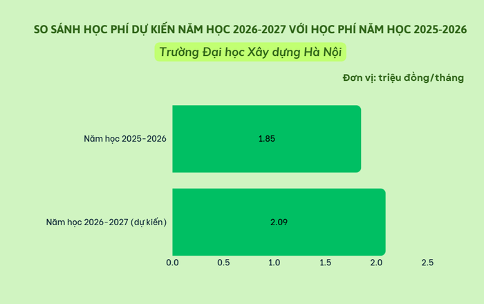 Theo thông tin tuyển sinh năm 2026 dự kiến của Trường Đại học Xây dựng Hà Nội, học phí đại học chính quy chương trình chuẩn (kỹ sư/kiến trúc sư/cử nhân) trung bình năm học 2026-2027 khoảng 20,9 triệu đồng/năm học (thu theo tín chỉ), tăng 2,4 triệu đồng so với năm trước.