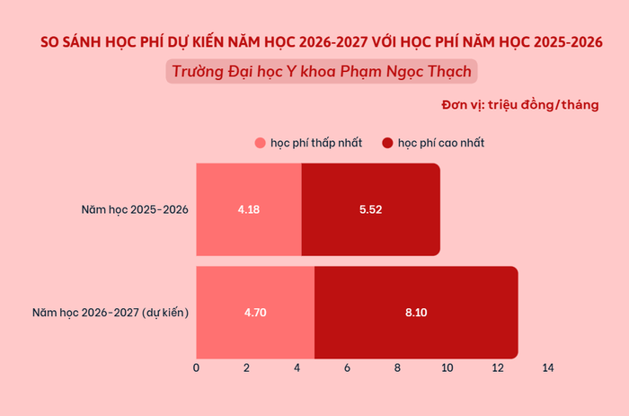 Đáng chú ý, Trường Đại học Y khoa Phạm Ngọc Thạch có mức điều chỉnh mạnh nhất khi học phí một số ngành như Y khoa, Răng - Hàm - Mặt tăng lên 81 triệu đồng/năm, cao hơn nhiều so với mức 55,2 triệu đồng/năm trước đó.
