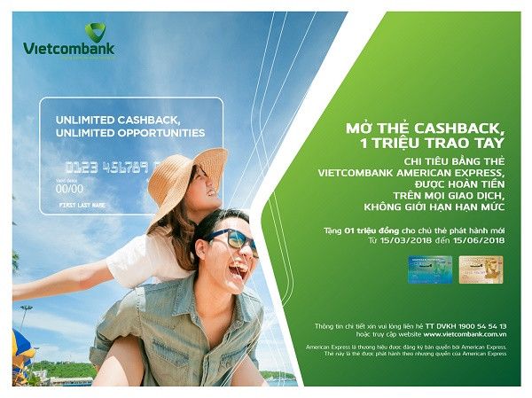 Theo chương trình, khách hàng phát hành lần đầu thẻ tín dụng Vietcombank American Express (gọi tắt là thẻ Amex truyền thống) và có doanh số sử dụng tối thiểu 2 triệu đồng trong thời gian khuyến mại sẽ được tặng 1 triệu đồng.