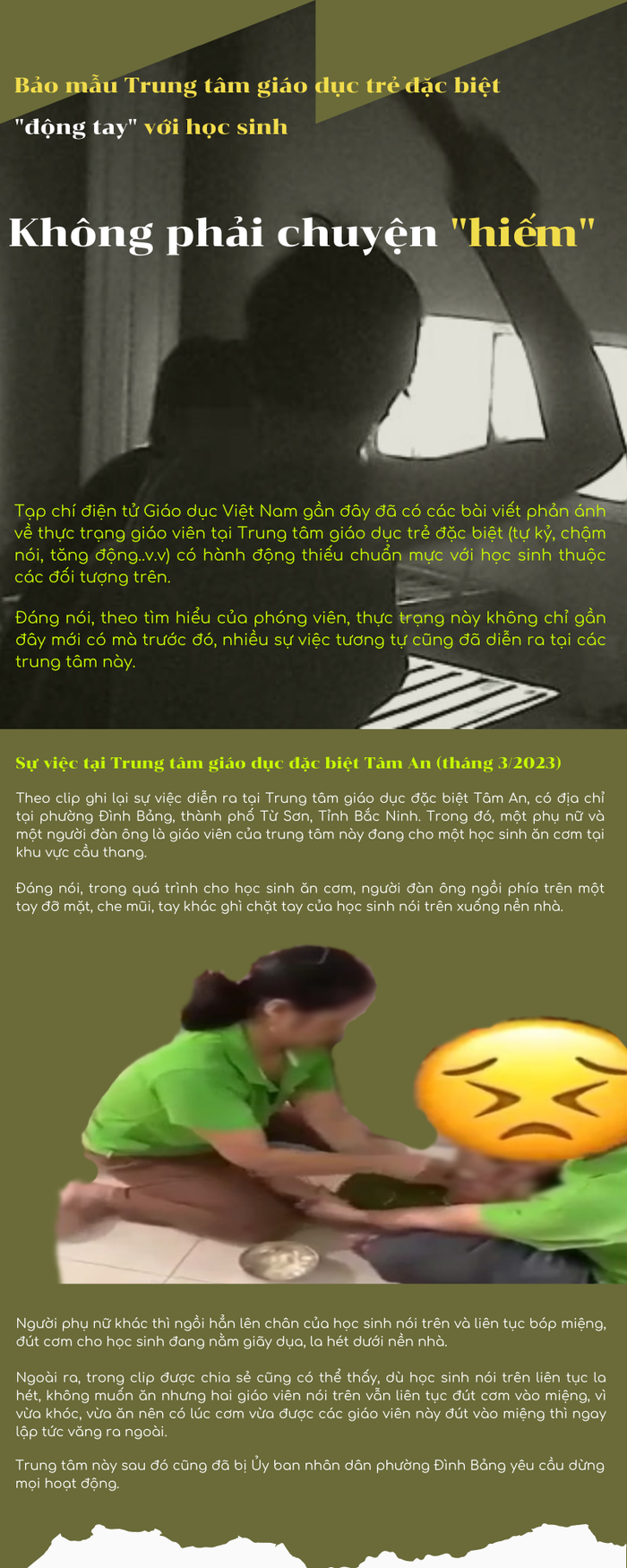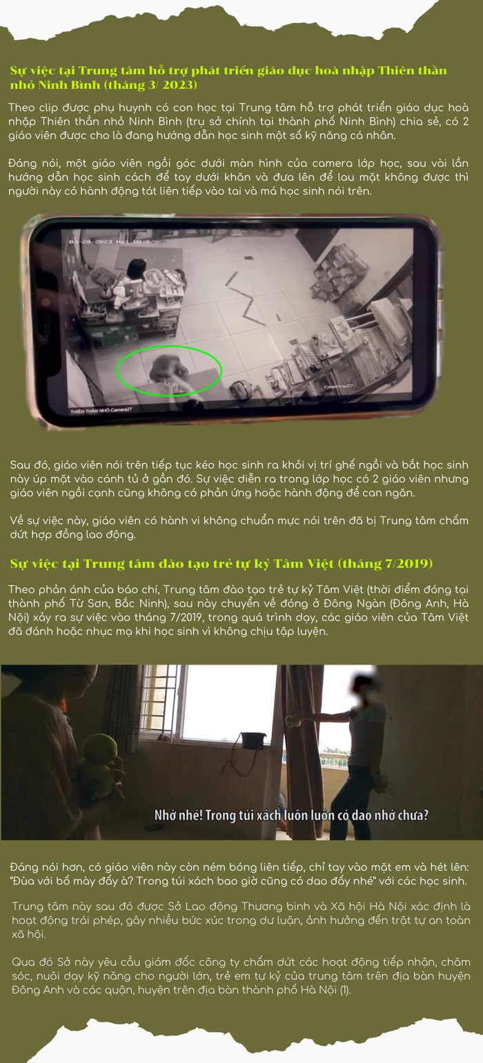 Cụ thể, ngoài sự việc tại Trung tâm giáo dục đặc biệt Tâm An (thành phố Từ Sơn, Bắc Ninh) "ép" học sinh ăn cơm và sự việc bảo mẫu ở Trung tâm hỗ trợ phát triển giáo dục hoà nhập Thiên thần nhỏ Ninh Bình đánh học sinh trong giờ học xảy ra mới đây, thì trước đó cũng đã có nhiều vụ việc khác được báo chí phản ánh.