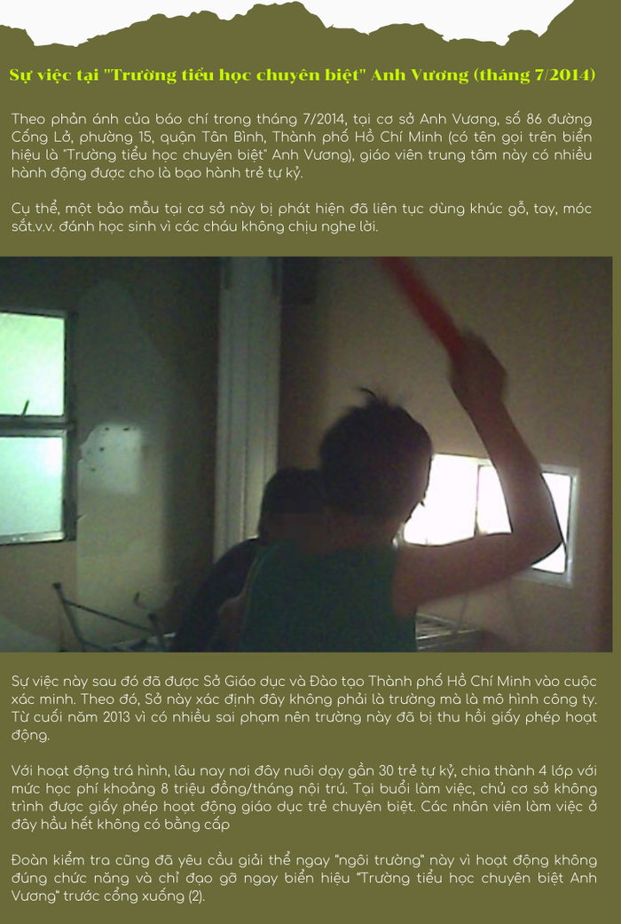 Ngoài ra, trong tháng 7/2014, tại cơ sở Anh Vương, số 86 đường Cống Lở, phường 15, quận Tân Bình, Thành phố Hồ Chí Minh, giáo viên trung tâm này có nhiều hành động được cho là bạo hành trẻ tự kỷ. Cụ thể, một bảo mẫu tại cơ sở này bị phát hiện đã liên tục dùng khúc gỗ, tay, móc sắt... đánh học sinh vì không chịu nghe lời. [2]
