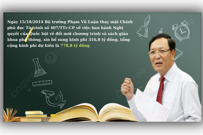 Đến ngày 15/10/2014, Bộ trưởng Phạm Vũ Luận thay mặt Chính phủ đọc Tờ trình số 407/TTr-CP về việc ban hành Nghị quyết của Quốc hội về đổi mới chương trình và sách giáo khoa phổ thông, xin bổ sung kinh phí 316,8 tỷ đồng, tổng cộng kinh phí dự kiến là 778,8 tỷ đồng, trong đó: