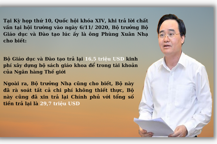 Ngoài ra, ông Phùng Xuân Nhạ cũng cho biết, Bộ này đã rà soát tất cả chi phí không thiết thực liên quan đến việc tập huấn, các công việc không hiệu quả, đặc biệt trong mùa dịch Covid-19 vừa qua. Vì thế, Bộ này cũng đã xin trả lại Chính phủ với tổng số tiền trả lại là 29,7 triệu USD (6).