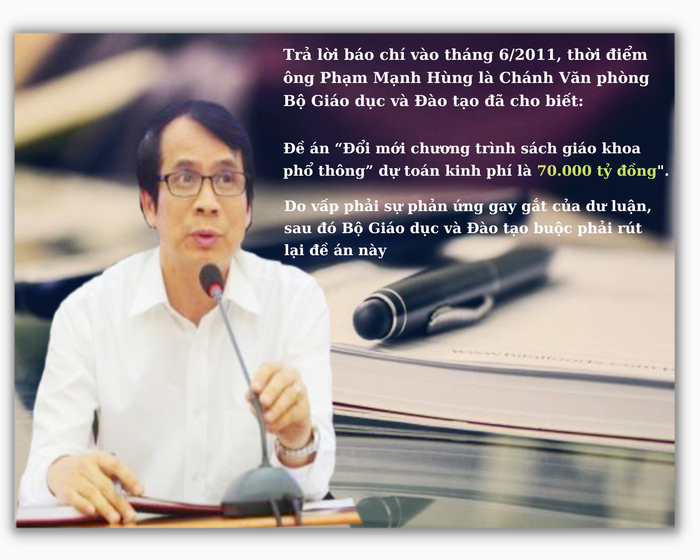 Tháng 6/2011, trả lời báo chí, ông Phạm Mạnh Hùng là Chánh Văn phòng Bộ Giáo dục và Đào tạo thời điểm đó đã cho biết: “Dự toán kinh phí là 70.000 tỷ đồng, trong đó số tiền chi cho việc biên soạn chương trình, sách giáo khoa chỉ khoảng hơn 960 tỷ (chưa đầy 1/70 tổng dự toán). Số tiền còn lại chi cho các việc khác như xây dựng cơ sở vật chất trường học khoảng 35 nghìn tỷ (chiếm 1/2 tổng dự toán).
