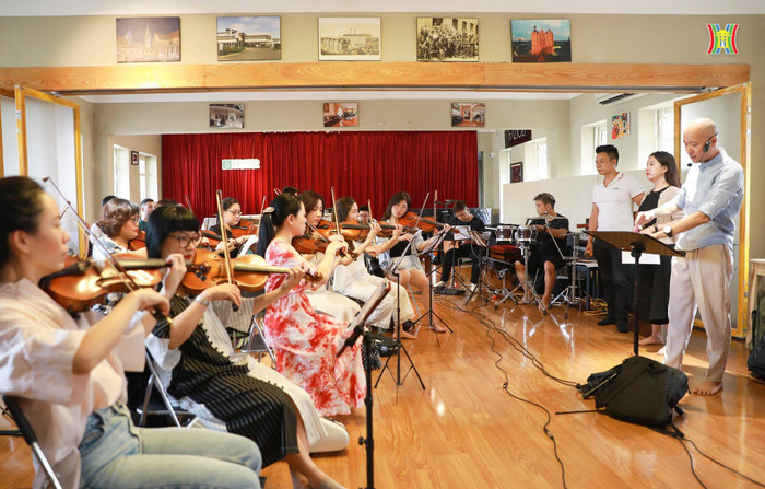 Các ca sĩ cùng dàn nhạc tập luyện chuẩn bị cho Chương trình “Tự hào người giáo viên nhân dân”. Ảnh: Văn Tuyến