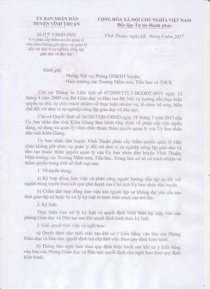 Theo hồ sơ, ngày 26/9/2017, Chủ tịch Ủy ban Nhân dân huyện Vĩnh Thuận đã ban hành văn bản số 139/UBND-PNV về việc phân cấp thẩm quyền quản lý viên chức không giữ chức vụ quản lý đối với đơn vị sự nghiệp công lập giáo dục và đào tạo.