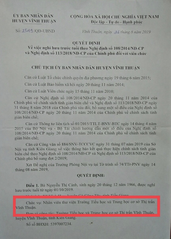 Cụ thể, ngày 26/08/2019, Ủy ban Nhân dân huyện Vĩnh Thuận ban hành quyết định số 2549 về việc nghỉ hưu trước tuổi cho viên chức theo Nghị định 108/2014/NĐ-CP cho cô giáo Cảnh.