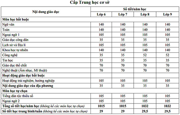 Chương trình mới ở bậc trung học cơ sở gồm các môn học được bố trí với số tiết như sau: