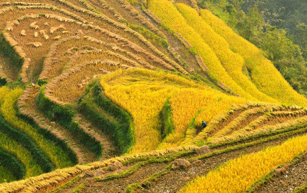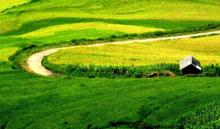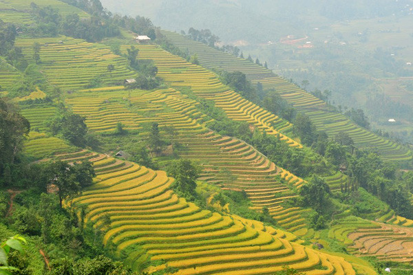 | Lúa vàng trải miên man từ đỉnh dốc xuống chân dốc. |