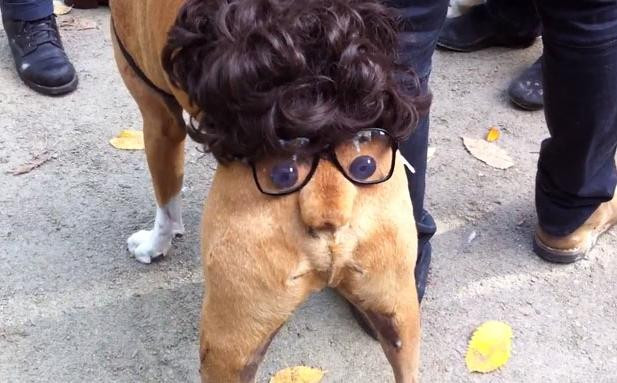 Chú chó được chủ nhân trang trí cho phần phía sau mông bằng hai con mắt cùng chiếc kính, trong khi chiếc đuôi cộc trở thành bộ phận mũi một cách rất tự nhiên. Chỉ cần gắn thêm bộ tóc giả, chú chó đã có khuôn mặt vô cùng độc đáo và vui nhộn ở trên mông.