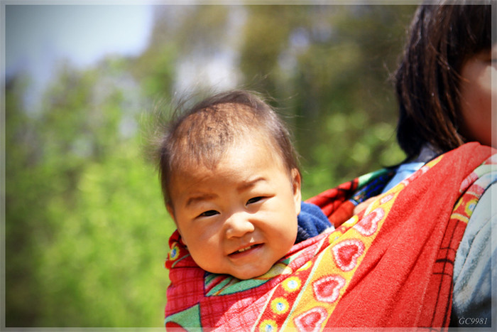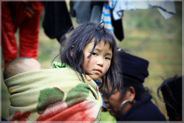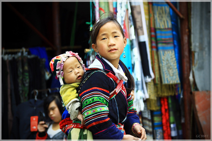 | Một nhóc tì người H'Mong đen được mẹ gùi trên đường đến chợ phiên, |