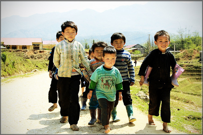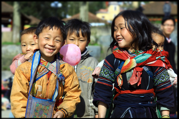 | Nụ cười bẽn lẽn của hai bé gái người H'Mong đen ở trung tâm thị trấn Sapa, Lào Cai. |
