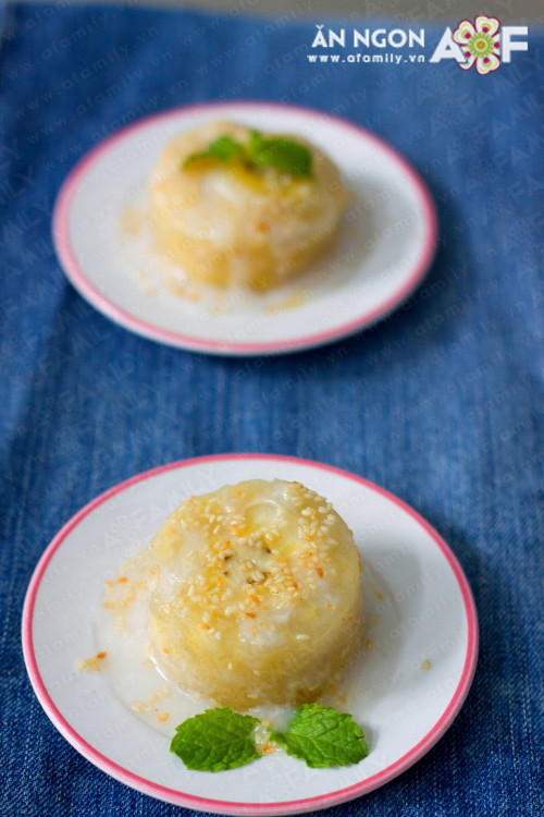 | Dùng 1 cái khuôn hấp bánh, phết ít dầu quanh khuôn, bỏ vào nồi hấp, khi khuôn hấp nóng lên thì đổ hỗn hợp bột - chuối vào. |