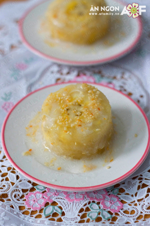 | Nguyên liệu: 200g bột năng 800g chuối sứ chín 200g dừa nạo 100g đường (50g đường vàng, 50g đường trắng) 1/4 thìa cà phê muối 1 ống vani 20g mè (vừng) trắng. |
