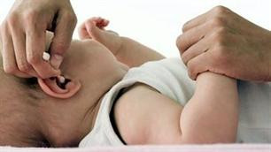 Chúng ta chỉ lau khi trẻ bị nước vào tai, hay khi ói sữa chảy vào tai.