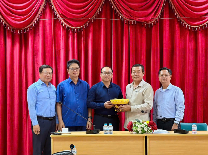 Đại diện Trường Đại học Suphanouvong tặng quà lưu niệm cho NXBGDVN.