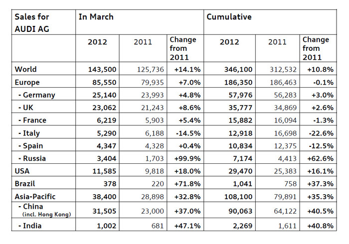 Với số lượng 346.100 xe được bán ra, đánh dấu một bước ngoặt lớn trong lịch sử hãng xe hơi Audi. Với con số này, Audi đã lập kỷ lục về doanh số bán hàng trong quý I năm nay, số lượng xe được bán ra tăng 10,8% so với năm ngoái. Tháng 3 cũng là tháng xuất sắc nhất trong lịch sử Audi với số lượng 143.500 xe được tiêu thụ trên thị trường thế giới.