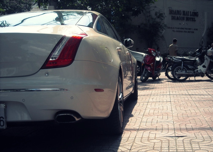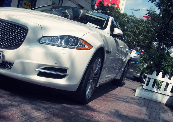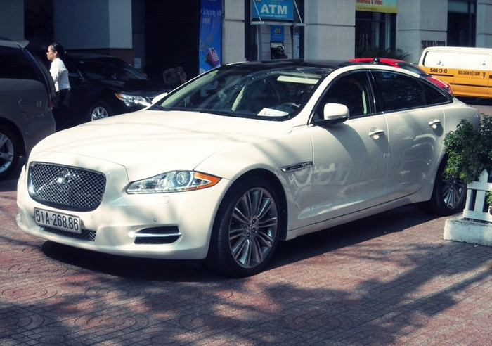 | Cận cảnh chiếc Jaguar XJL trắng tại Việt Nam: Phiên bản XJL có kích thước dài tổng thể 5.248 mm, rộng 2.111 mm và cao 1.448 mm. Chiều dài cơ sở 3.157 mm. XJL được xếp cùng phân khúc xe thân dài với Audi A8L, BMW 750Li hay Mercedes S500L. |