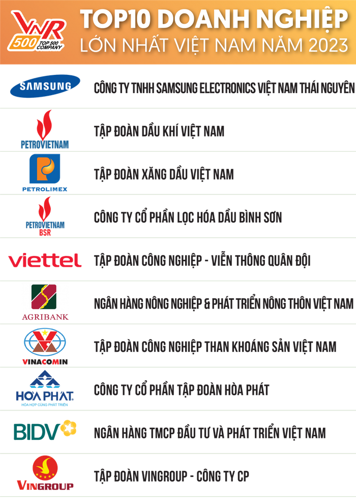 Ngày 17/11, Công ty Cổ phần Báo cáo Đánh giá Việt Nam (Vietnam Report) phối hợp cùng Báo VietnamNet công bố Bảng xếp hạng VNR500 - Top 500 Doanh nghiệp lớn nhất Việt Nam năm 2023; trong đó Tập đoàn Dầu khí Việt Nam (Petrovietnam) tiếp tục giữ vững vị trí trong Top 3 doanh nghiệp hàng đầu cùng với Công ty TNHH Samsung Electronics Việt Nam Thái Nguyên và Tập đoàn Xăng dầu Việt Nam (Petrolimex).