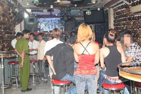 Một số khách có lẽ chưa đủ hứng khởi ngồi yên tại bàn thì được tiếp viên nữ tới tận nơi, sà vào lòng, uốn éo, vuốt ve mời gọi.