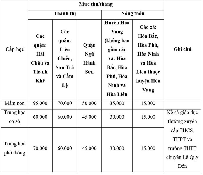 Thực hiện Nghị định số 81/2021/NĐ-CP và chỉ đạo của Ủy ban nhân dân thành phố, Sở Giáo dục và Đào tạo đã tham mưu Ủy ban nhân dân thành phố trình Hội đồng nhân dân thành phố ban hành Nghị quyết số 46/2022/NQ-HĐND ngày 14/7/2022 quy định mức thu học phí giáo dục mầm non, giáo dục phổ thông công lập năm học 2022-2023 trên địa bàn thành phố Đà Nẵng với mức thu mới như sau (đây là mức thu thấp nhất trong khung học phí quy định tại Nghị định số 81/2021/NĐ-CP):