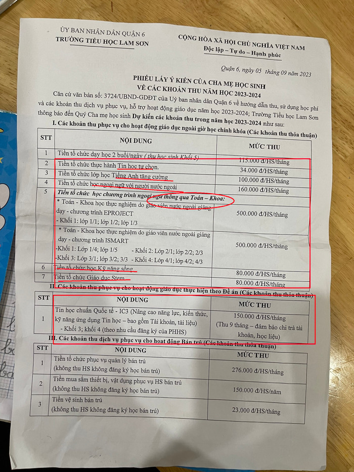 *Tờ thông báo ghi: Các khoản thu phục vụ cho hoạt động giáo dục ngoài giờ học chính khóa (ghi rõ là các khoản thu thỏa thuận) gồm: