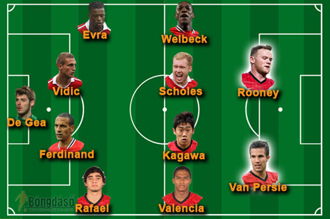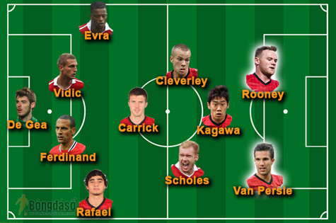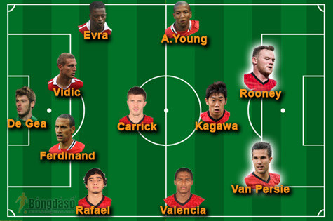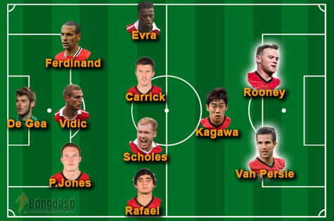 - Nếu sử dụng đội hình này, Sir Alex vẫn giữ được cặp tiền đạo Rooney – Van Persie, hộ công Kagawa nhưng sẽ cải thiện được khả năng tranh chấp bóng của tuyến giữa. Gánh nặng phòng ngự của Michael Carrick sẽ được chia sẻ bởi 2 tiền vệ box-to-box (vừa thủ vừa công) là Tom Cleverley và Paul Scholes.