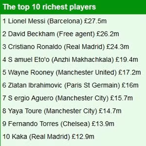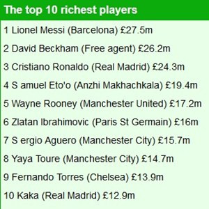 Top 10 cầu thủ có thu nhập cao nhất thế giới (đơn vị: triệu bảng)