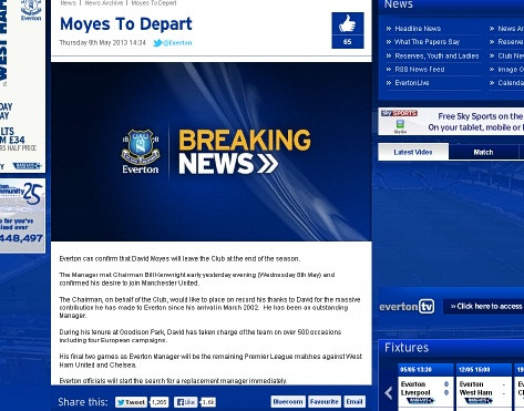 Trên trang chủ của Everton, CLB thông báo quyết định từ chức của David Moyes: “Everton xin được khẳng định rằng ông David Moyes sẽ rời CLB vào cuối mùa giải này. Ông Moyes đã gặp chủ tịch Bill Kenwright vào tối hôm qua (8/5) và khẳng định mong muốn được gia nhập Manchester United của mình”.