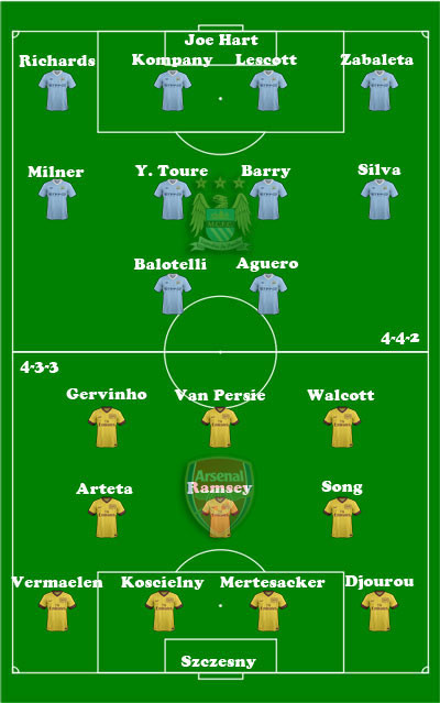 Roberto Mancini sẽ sử dụng Pablo Zabaleta (bạn thân của Tevez) vào vị trí hậu vệ trái vì cựu hậu vệ của Arsenal, Gael Clichy bị treo giò, trong khi Alexander Kolarov phải dưỡng thương vì đau háng. Bên cánh đối diện, Micah Richards đã trở lại sau hai tuần bị đau bắp đùi. Tuyến tiền vệ và cặp song sát vẫn là những nhân vật quen thuộc.