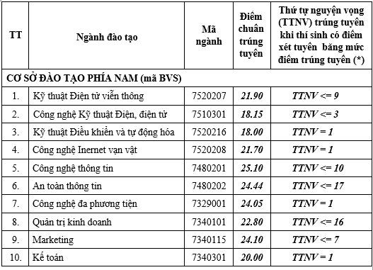 Tại cơ sở đào tạo phía Nam, điểm chuẩn cao nhất thuộc về ngành Công nghệ thông tin (25,10 điểm). Ngành Kỹ thuật Điều khiển và Tự động hóa có mức điểm chuẩn thấp nhất (18,00 điểm).