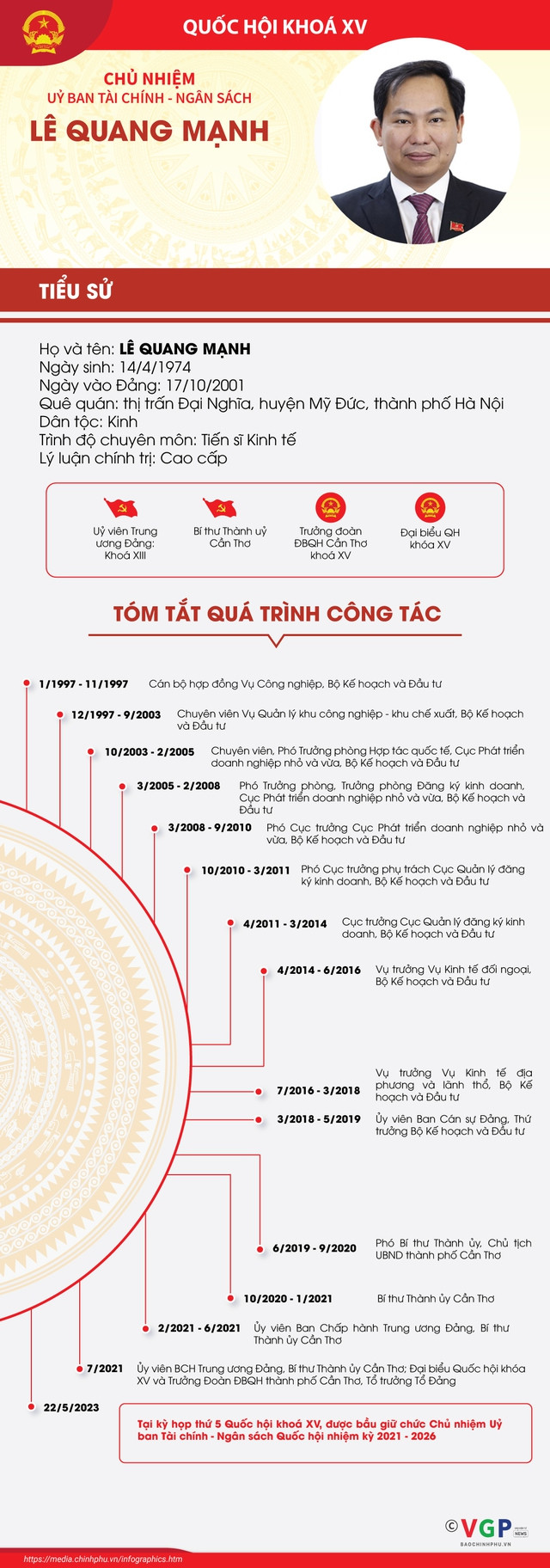 Kết quả, Quốc hội đã bầu ông Lê Quang Mạnh giữ chức Ủy viên Ủy ban thường vụ Quốc hội, Chủ nhiệm Ủy ban Tài chính - Ngân sách của Quốc hội khóa XV.