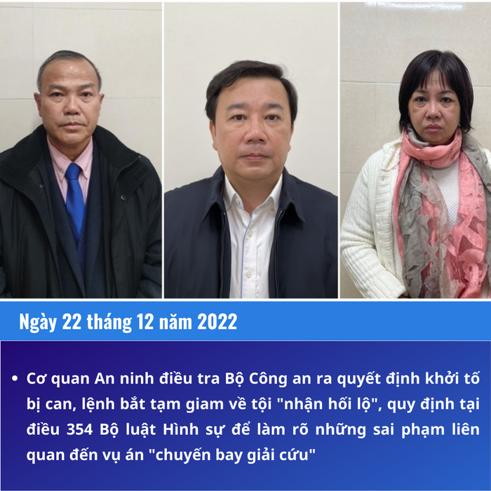 Mở rộng điều tra vụ án "Đưa hối lộ, nhận hối lộ, môi giới hối lộ; lợi dụng chức vụ, quyền hạn trong khi thi hành công vụ và lừa đảo chiếm đoạt tài sản" xảy ra tại Bộ Ngoại giao, Hà Nội và các tỉnh, thành phố, ngày 22/12/2022, Cơ quan An ninh điều tra Bộ Công an khởi tố bị can, ra lệnh bắt bị can để tạm giam, lệnh khám xét chỗ ở và nơi làm việc đối với 3 bị can.