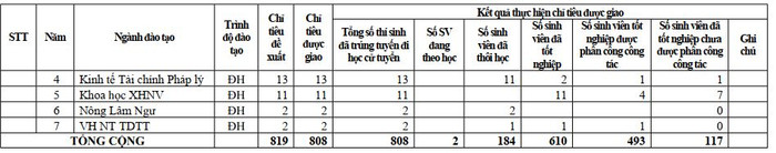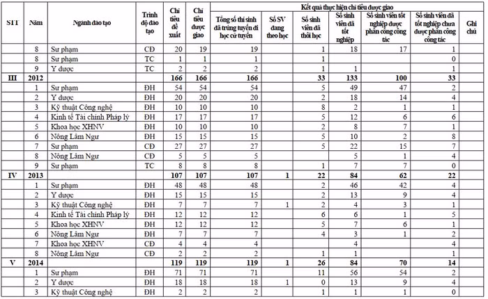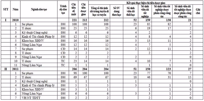Trong đó, từ năm 2010 đến năm 2014, đối với lĩnh vực Sư phạm, được giao tổng chỉ tiêu như sau: 381 đại học, 60 cao đẳng, 9 trung cấp (trúng tuyển 100%). Số sinh viên đã tốt nghiệp: 313 đại học, 52 cao đẳng, 7 trung cấp. Số sinh viên tốt nghiệp được phân công công tác: 295 đại học, 43 cao đẳng, 7 trung cấp.