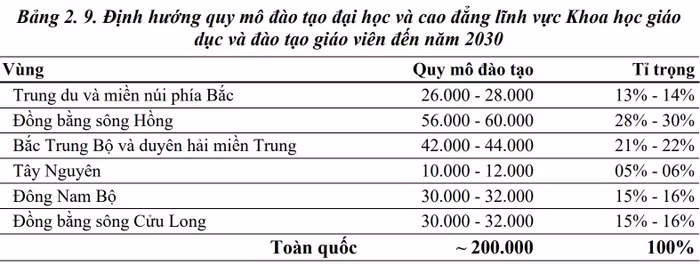 Tới năm 2030, quy mô đào tạo lĩnh vực Khoa học giáo dục và đào tạo giáo viên khoảng 180.000 sinh viên đại học và 20.000 sinh viên cao đẳng sư phạm, trong đó các ngành đào tạo giáo viên cho cấp học mầm non chiếm khoảng 40%, tiểu học 15%, trung học cơ sở và trung học phổ thông 45%; định hướng quy mô đào tạo tại các vùng như trong bảng dưới đây: