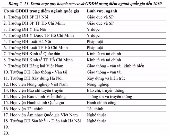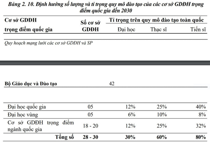 Khoảng 30 cơ sở giáo dục đại học trọng điểm quốc gia, bao gồm 5 đại học quốc gia, 5 đại học vùng và từ 18 đến 20 cơ sở giáo dục đại học trọng điểm ngành quốc gia;