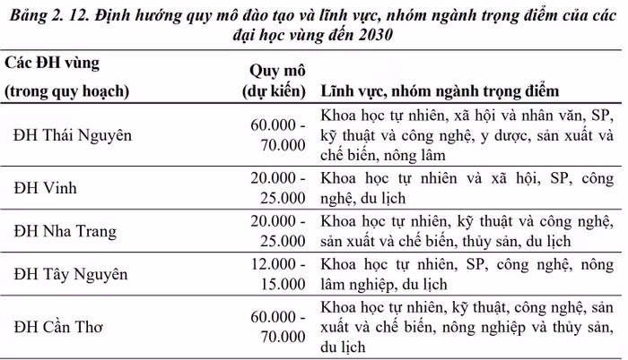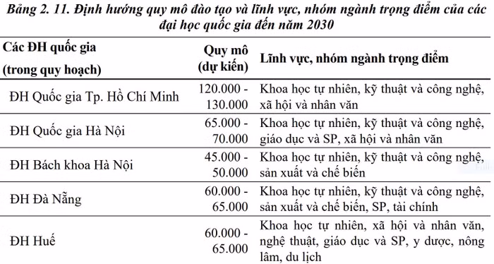 Các đại học quốc gia giữ ổn định quy mô đào tạo trình độ đại học, tập trung nâng cao chất lượng và tăng tỉ trọng đào tạo sau đại học gắn với phát triển nghiên cứu và đổi mới sáng tạo, nhất là ở các lĩnh vực, ngành trọng điểm. Sau năm 2030, có thể phát triển thêm một số đại học quốc gia từ các đại học vùng, đại học trọng điểm ngành quốc gia có tiềm lực mạnh và uy tín cao trong hệ thống.