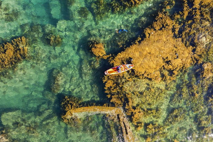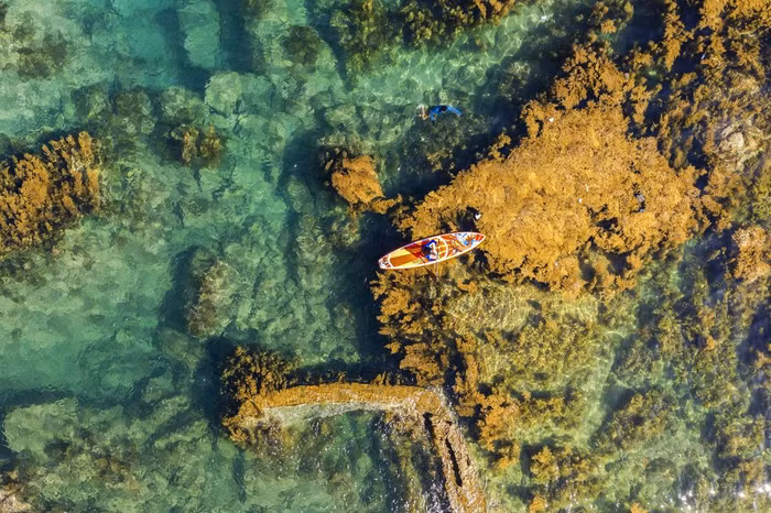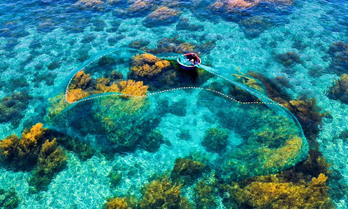 Ngoài ngắm biển “thay áo mới”, du khách còn được hoà mình vào cuộc sống bình yên vùng chài lưới. Ngư dân chèo thuyền thúng đánh bắt cá trên vùng biển Nhơn Hải, bên dưới là rừng rong mơ ngoi mình lên mặt nước, đu đưa theo dòng chảy, quyến rũ lạ kỳ!