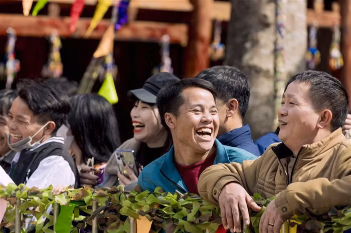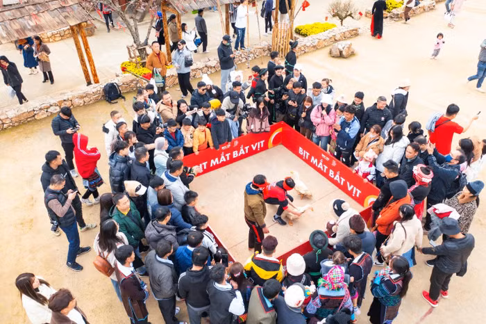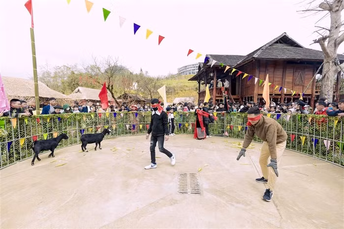 Nhiều du khách thích thú và phấn khích khi tham gia chơi bịt mắt bắt dê, bịt mắt bắt vịt, leo cột mỡ, đi cà kheo… tại Bản Mây trong khuôn khổ Hội Xuân Mở Cổng trời 2024. Dịp này, khu du lịch miễn phí vé vào cổng cho tất cả du khách, khiến cho hội xuân càng thêm hấp dẫn.