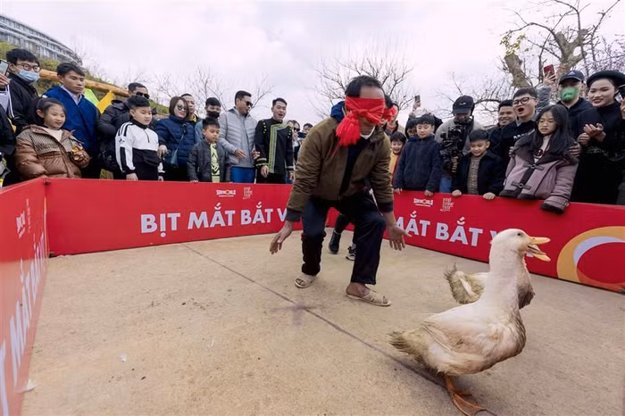 Trò chơi bịt mắt bắt vịt luôn đem đến không khí gay cấn và những tràng cười rộn rã nhất. Khán giả phấn khích cổ vũ trước những “chiến binh” săn bắt vịt.