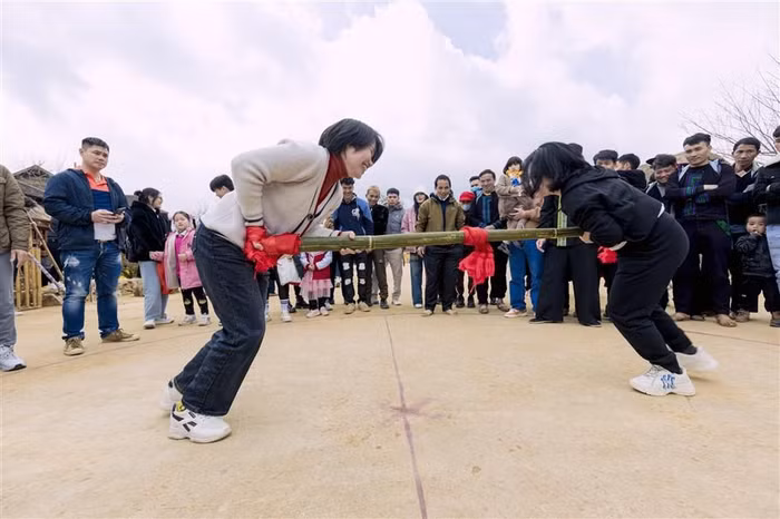 Trò chơi đẩy gậy cũng hấp dẫn nam thanh nữ tú tham gia, tạo nên bầu không khí lễ hội tưng bừng và vui vẻ. "Thật may mắn khi được đi Sa Pa đúng dịp diễn ra Hội Xuân Mở Cổng trời, gia đình tôi không chỉ được đi lễ cầu an, mà còn được trải nghiệm vô số các hoạt động văn hóa hấp dẫn ở Bản Mây. Thật là một chuyến đi đa trải nghiệm và giàu cảm xúc”- chị Minh Hải, du khách đến từ Hà Nội chia sẻ.