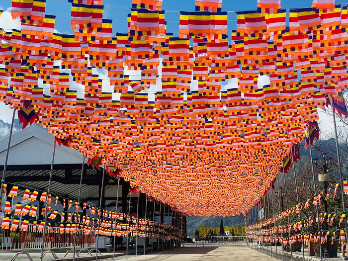 Cùng với đó, rất nhiều tiểu cảnh từ hoa cũng được trang hoàng tại khu vực tiến hành đại lễ - Kim Sơn Bảo Thắng Tự - tạo nên không gian đại lễ quy mô, thành kính, để các tăng ni, Phật tử và du khách cảm nhận sự thiêng liêng, nhất tâm hướng lòng thành cầu nguyện quốc thái dân an.