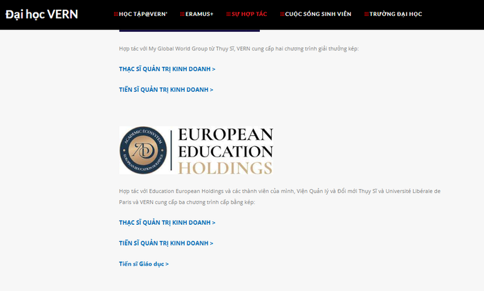 Theo tìm hiểu của phóng viên, tại trang web có tên Trường Đại học VERN tại địa chỉ https://www.vernuni.eu/ (tên miền quốc tế), đơn vị này quảng cáo hợp tác đào tạo Chương trình MBA với European Education Holdings. Trong đó, đào tạo về thạc sĩ - tiến sĩ Quản trị kinh doanh, tiến sĩ Giáo dục.